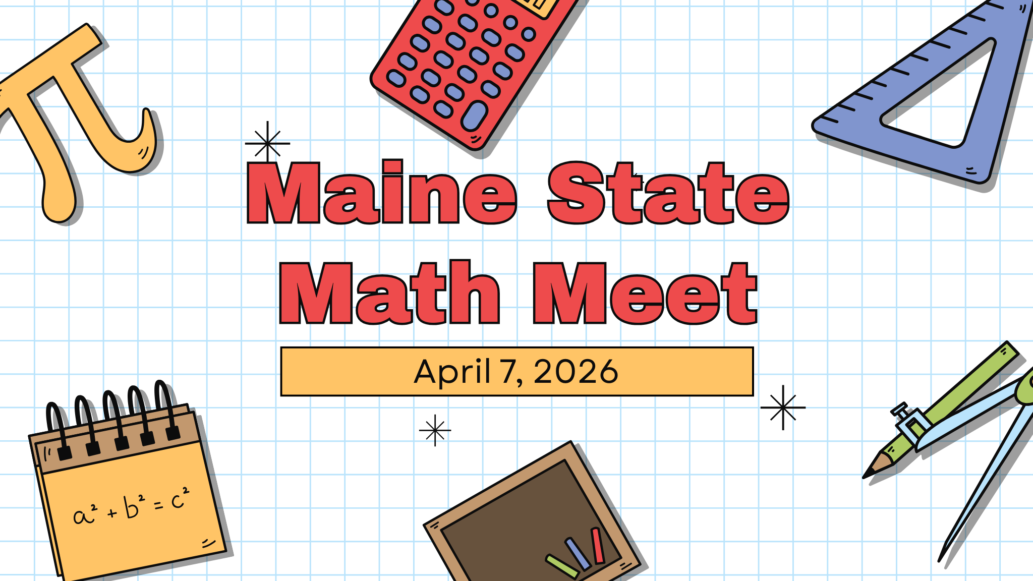 The Maine State Math Meet will be at the Augusta Civic Center on April 7th, 2026. Approximately 100 teams compete, with ten students per team.